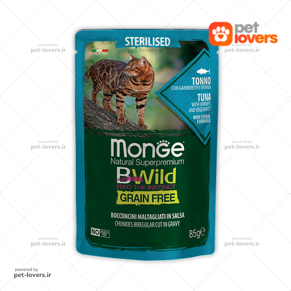 پوچ گربه مونژه استرلایزد مدل BWild Grain Free Adult با طعم ماهی تن، شاه میگو و سبزیجات وزن 85 گرم