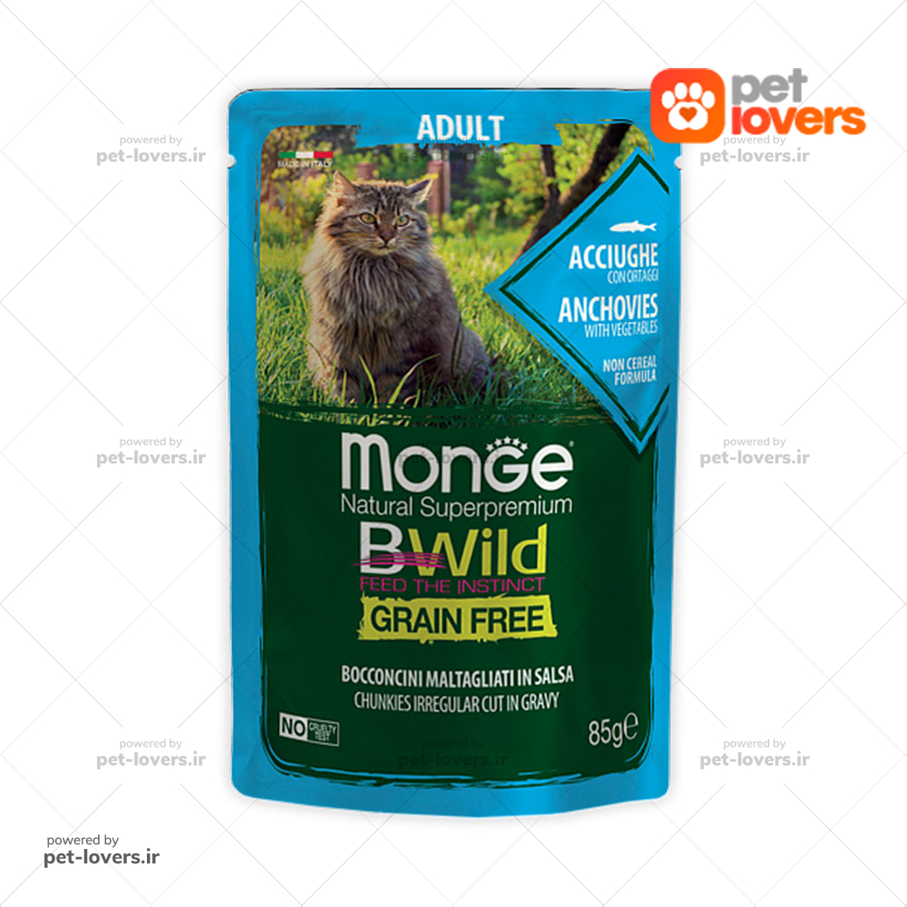 پوچ گربه مونژه مدل BWild Grain Free Adult با طعم ماهی کولی و سبزیجات وزن 85 گرم
